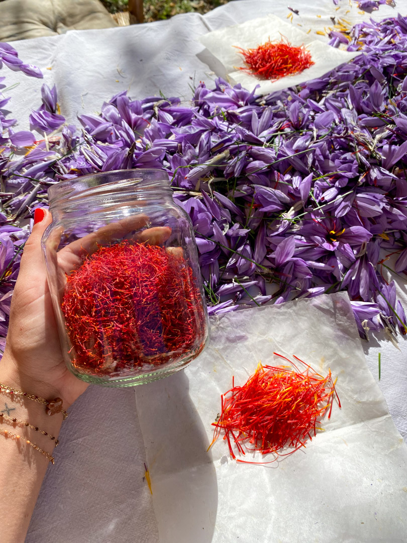 C’est au petit matin, avant que la fleur ne soit totalement ouverte, qu’il faut la cueillir avant qu’elle ne se fane et que les pistils deviennent trop difficiles à retirer. Cette fleur très délicate demande à être manipulée avec d’infinies précautions. Pour la même raison, il faut procéder immédiatement à l’émondage. Une opération longue et minutieuse : chaque fleur doit être prise une à une à la main afin de retirer les trois stigmates en les pinçant entre le pouce et l’index de l’autre main. Les stigmates, ainsi séparés, constituent le safran ; ils seront séchés pour assurer la conservation et développer l’odeur aromatique très spéciale de cette épice.