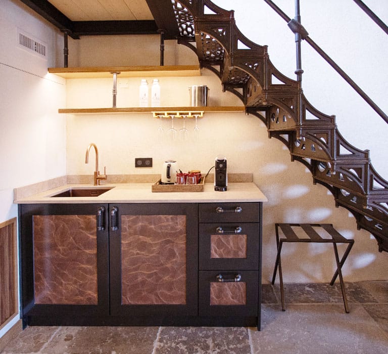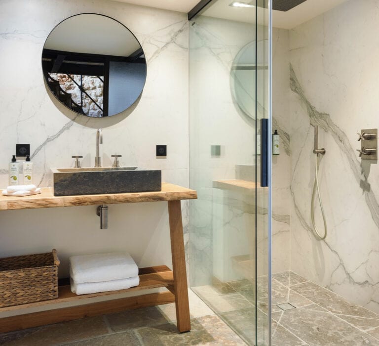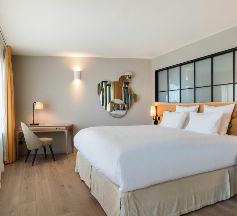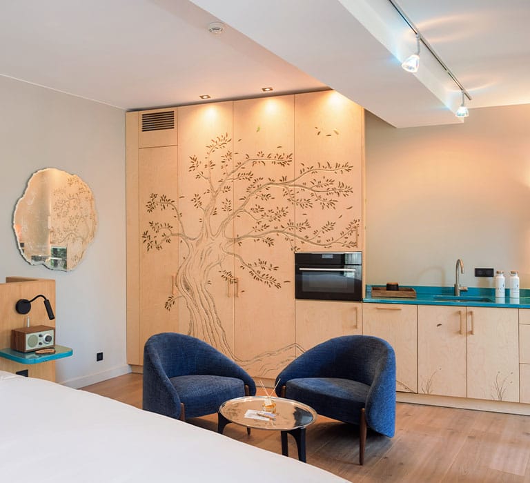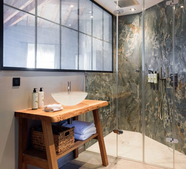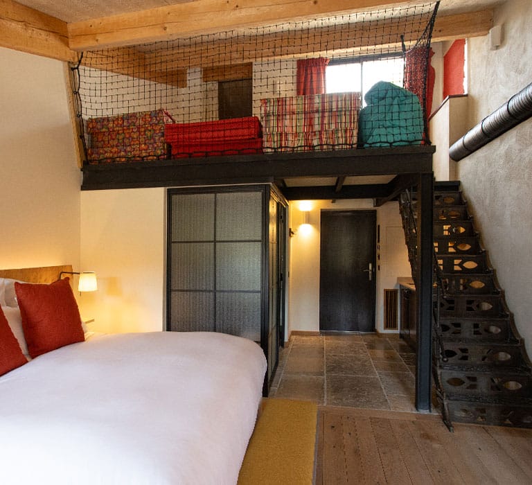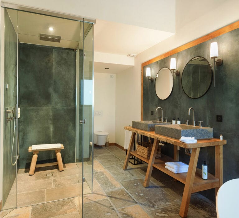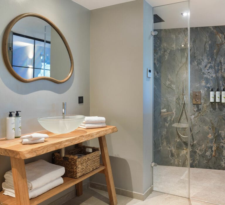Un caractère affirmé pour cette suite habillée de bois, de pierre et de marbre, complété par des matériaux nobles entremêlés avec harmonie. Avec sa deuxième chambrette en mezzanine, son coin salon, et sa terrasse tropézienne perchée à l’abri des regards, elle est idéale pour les petites familles.