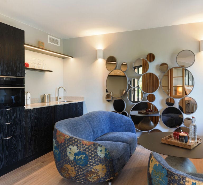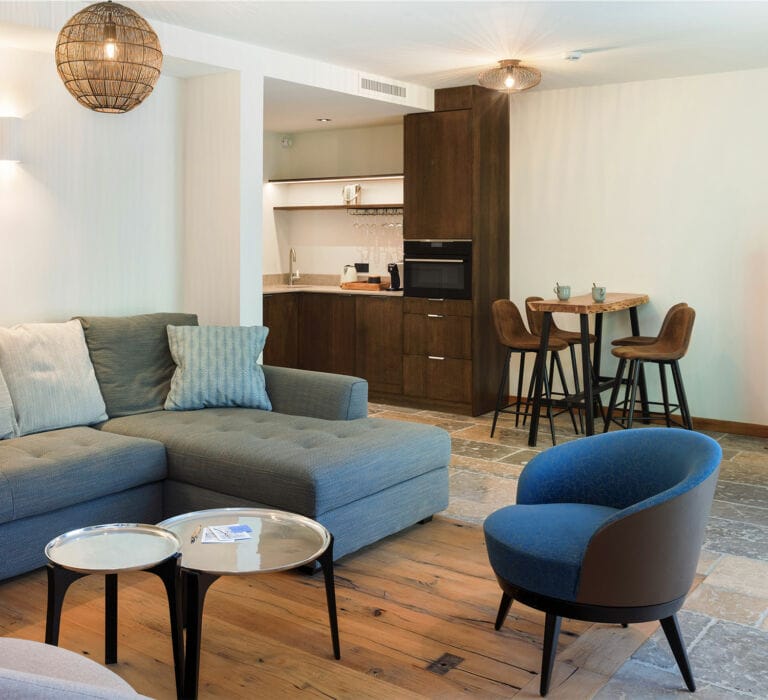 Vous voyagez en tribu ? Vous aimez le confort et les grands espaces ? Alors cette suite majestueuse est faite pour vous, avec ses deux belles chambres doubles, son salon séparé et sa cuisine entièrement équipée. En bonus, une troisième chambre, plus intimiste, pour les petits ou la super Nanny qui vous accompagne. Les 100m2 de cette suite se prolongent sur une charmante terrasse pittoresque avec son bassin glougloutant.